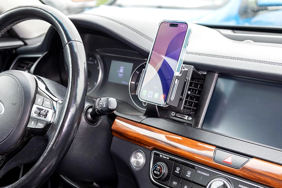 Stały punkt podparcia ogranicza amplitudę drgań i skraca czas wygaszania po najechaniu na próg. Pozycja względem kierowcy jest przewidywalna, co ułatwia ergonomiczne ustawienie pod CarPlay/Android Auto i zmniejsza liczbę niecelnych dotknięć ekranu.