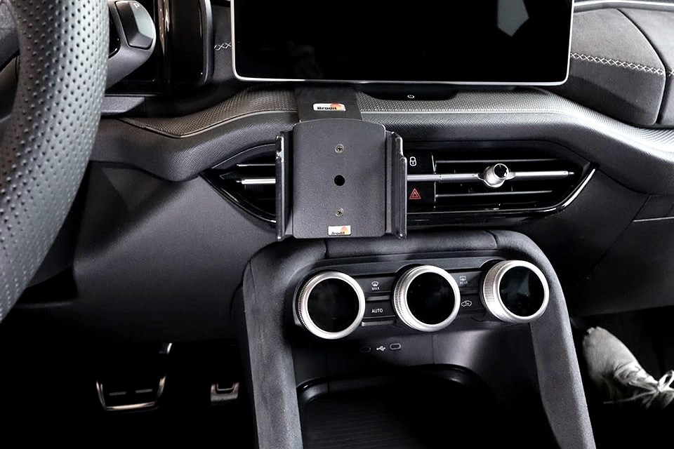 ProClip Brodit to dedykowana baza dla konkretnego modelu auta. Montuje się ją do stałych krawędzi konsoli lub szczelin łączeń, bez ingerencji w oryginalne plastiki. Dzięki temu łopatki kratki nie są elementem nośnym i nie przenoszą obciążeń od telefonu.