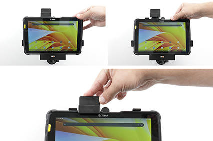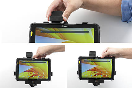 • 741320 - uchwyt pasywny o wzmocnionej konstrukcji z blokadą sprężynową do Zebra ET40 10.0. Jest specjalnie dopasowany do urządzeń, które są wyposażone w ochronną ramkę.