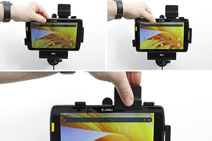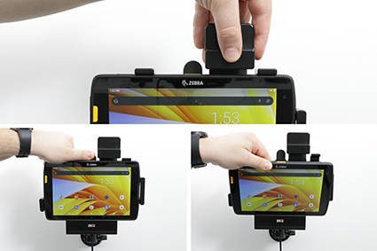 747317 - uchwyt aktywny o wzmocnionej konstrukcji z blokadą sprężynową do Zebra ET40 8.0. Jest specjalnie dopasowany do urządzeń, które nie są wyposażone w ochronną ramkę.