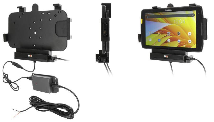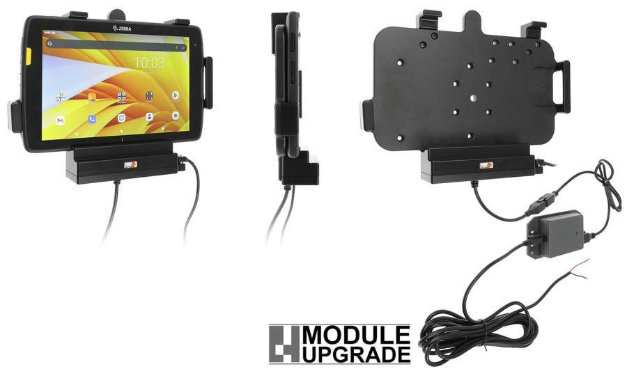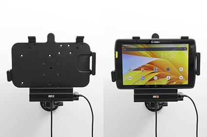 - 713323 - uchwyt aktywny o wzmocnionej konstrukcji z modułem komunikacyjno-ładującym do Zebra ET40 8.0. Jest specjalnie dopasowany do urządzeń, które nie są wyposażone w ochronną ramkę.