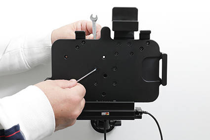 Uchwyt został wykonany z bardzo mocnego i wytrzymałego tworzywa ABS. Zamontuj go do dowolnej płaskiej powierzchni, w samochodzie ciężarowym, w magazynie, na wózku widłowym itp. Uchwyt posiada w swojej tylnej części standardowe otwory AMPS i VESA. Uchwyt nie ogranicza dostępu do kamery, wszystkich przycisków funkcyjnych i portów elektronicznych.