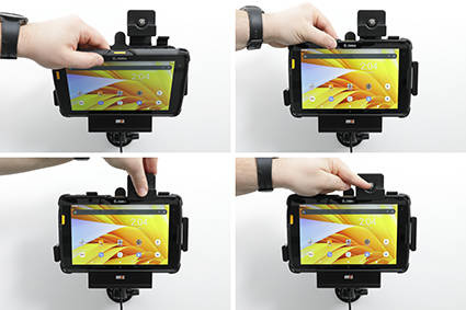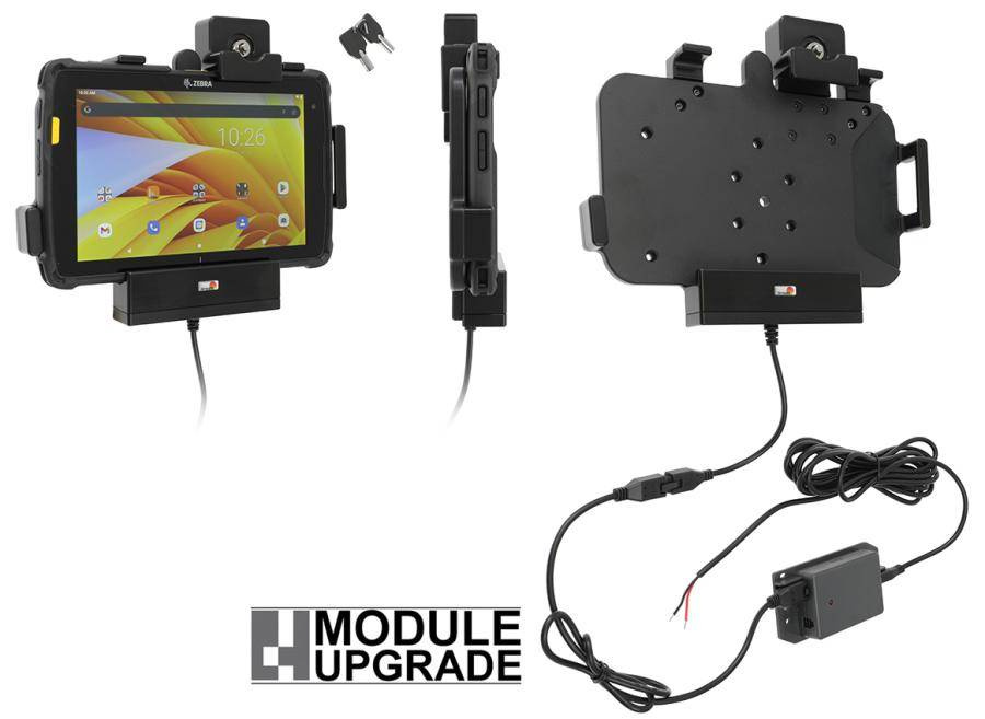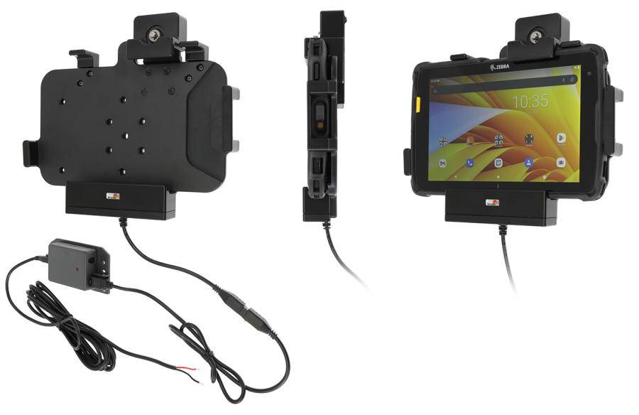 - 736318 - uchwyt aktywny o wzmocnionej konstrukcji z blokadą kluczykową do Zebra ET40 8.0. Jest specjalnie dopasowany do urządzeń, które są wyposażone w ochronną ramkę.