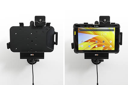 - 736318 - uchwyt aktywny o wzmocnionej konstrukcji z blokadą kluczykową do Zebra ET45 8.0. Jest specjalnie dopasowany do urządzeń, które są wyposażone w ochronną ramkę.