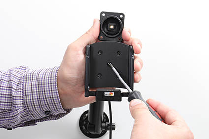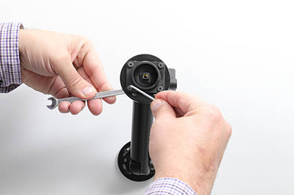 3. Umieść uchwyt na płytce montażowej głowicy obrotowej w taki sposób, aby można było dokręcić śrubę znajdującą się w centralnej części uchwytu. Śrubę należy dokręcić dość mocno, a następnie lekko poluzować, aby możliwa była regulacja uchwytu.