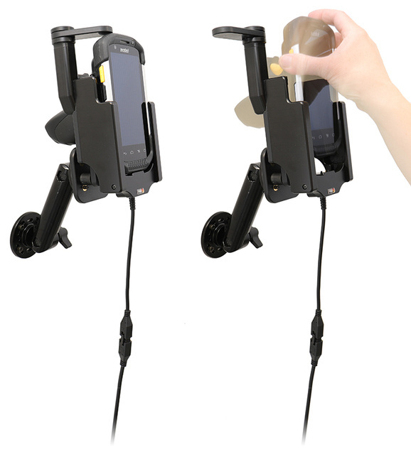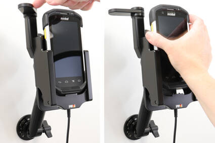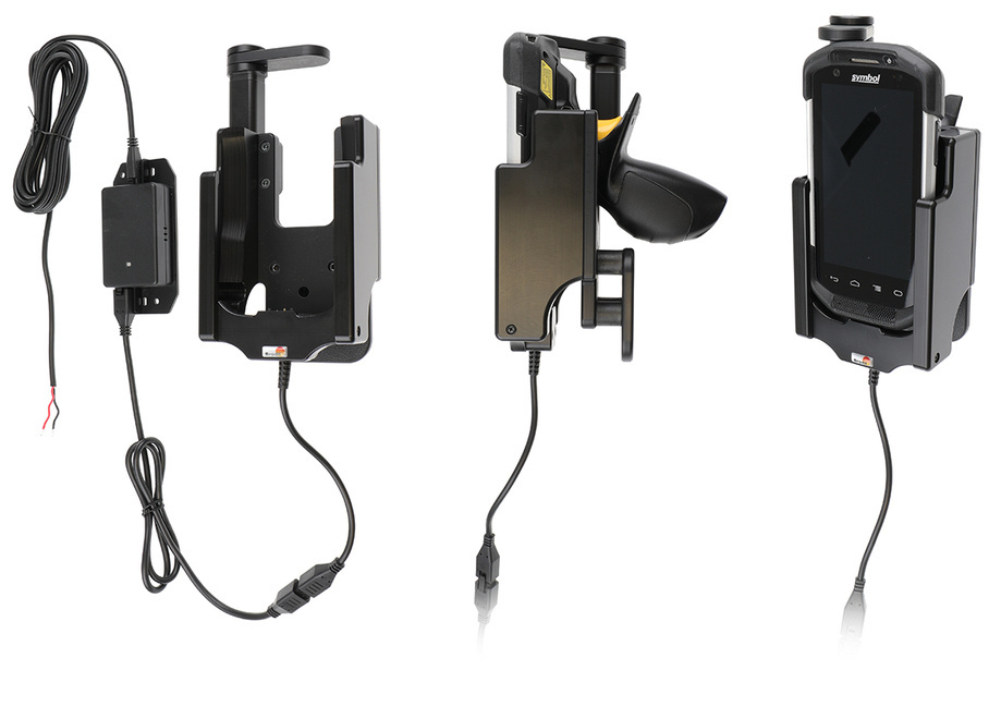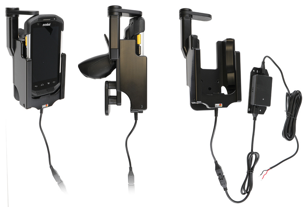 - 713138 - Brodit uchwyt aktywny do instalacji na stałe, z dodatkowym zabezpieczeniem, adapterem Molex (2A ładowarką) oraz z płytką antywibracyjną do Zebra TC70. Pasuje do wszystkich wersji pistoletowych.
