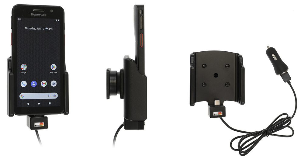 721334 - Honeywell CT30XP, uchwyt aktywny marki Brodit z ładowaniem poprzez gniazdo zapalniczki 12/24V, kablem USB-A oraz z wbudowaną głowicą obrotową.