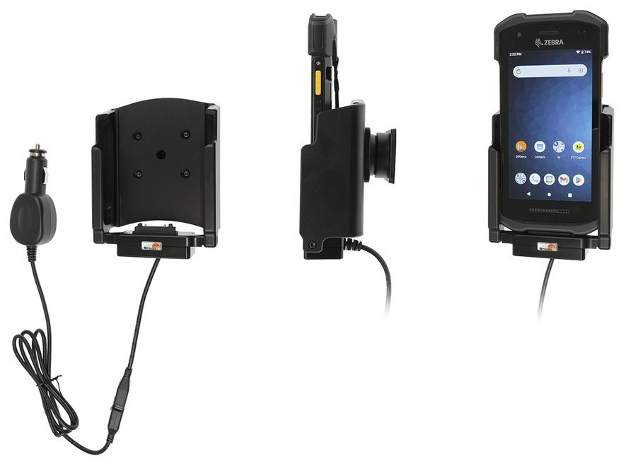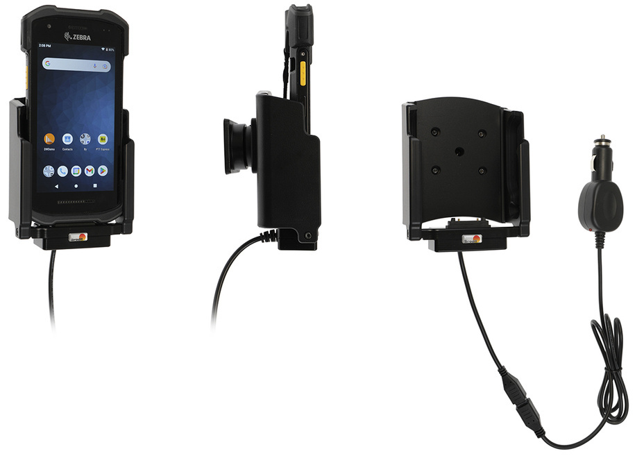 - 712338 - Brodit uchwyt aktywny z wtykiem do gniazda zapalniczki Zebra TC26. Z przegubem obrotowym. Ładowanie 3A. 12/24V. Z systemem łatwego przełączania. Ładowanie za pomocą wtyków pogo. Pasuje do urządzeń z oryginalną nasadką Zebra (SG-TC2Y-BOOT-01).