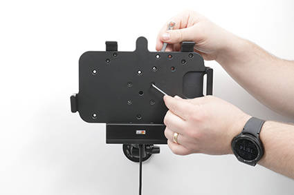 Uchwyt został wykonany z bardzo mocnego i wytrzymałego tworzywa ABS. Zamontuj go do dowolnej płaskiej powierzchni, w samochodzie ciężarowym, w magazynie, na wózku widłowym itp. Uchwyt posiada w swojej tylnej części standardowe otwory AMPS i VESA. Uchwyt nie ogranicza dostępu do kamery, wszystkich przycisków funkcyjnych i portów elektronicznych.