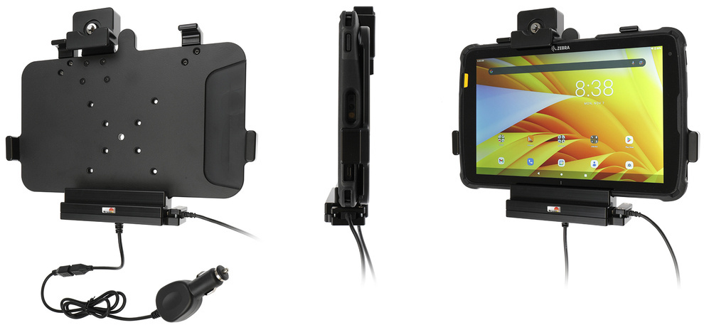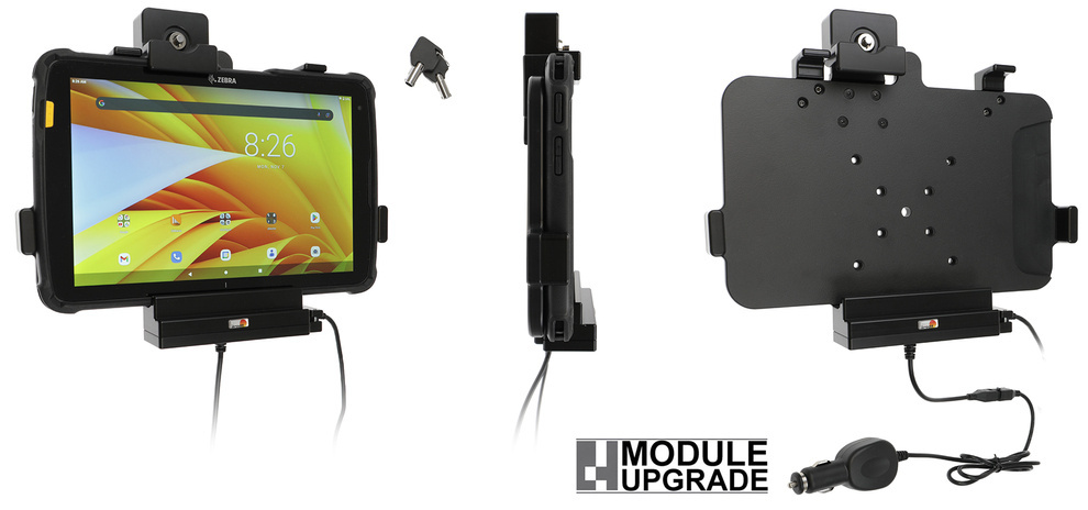 735326 - uchwyt aktywny o wzmocnionej konstrukcji do Zebra ET40 10.0 z blokadą kluczykową oraz obsługą urządzeń peryferyjnych. Jest specjalnie dopasowany do urządzeń, które są wyposażone w ochronną ramkę/egzoszkielet.