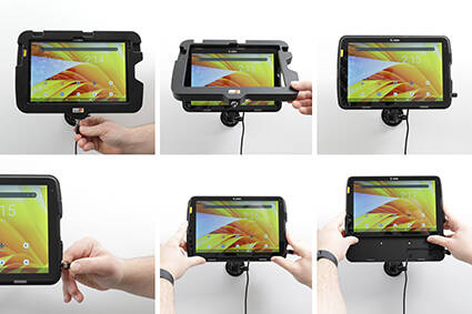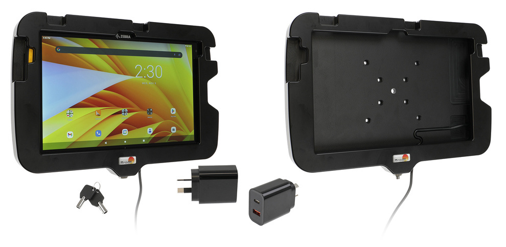 • 216335 - Uchwyt ścienny z wytrzymałym rękawem. Z kablem zasilającym i adapterem ściennym AU oraz ładowarką QC + PD. Pasuje do urządzeń bez Rugged Boot / Exoskeleton. Z AMPS, otworami VESA 75.