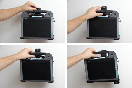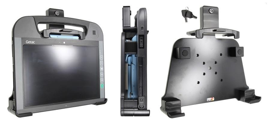 - 539861 - Brodit uchwyt pasywny posiadający otwory w systemie VESA oraz z blokadą sprężynową na kluczyk do Getac RX10. Pasuje do urządzeń z lub bez paska na rękę.