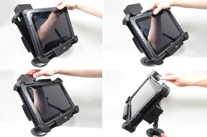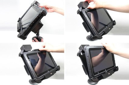 Uchwyt wykonany jest z bardzo mocnego i wytrzymałego tworzywa ABS. Zamontuj go do dowolnej płaskiej powierzchni, w samochodzie ciężarowym, w magazynie, na wózku widłowym itp. Uchwyt posiada w swojej tylnej części standardowe otwory AMPS i VESA. Gdy urządzenie znajduje się w uchwycie, jest pełny dostęp do kamery, wszystkich przycisków funkcyjnych i portów elektronicznych.