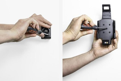 Uchwyt wyposażony jest w głowicę obrotową, która umożliwia jego regulację w różnych kierunkach w celu np. uniknięcia odbicia światła na ekranie. Możesz regulować ustawienie uchwytu o 22° w każdym kierunku. Uchwyt umożliwia jednocześnie ustawienie terminala w pionie lub w poziomie. Zamontuj swój uchwyt do terminala na ProClip’ie samochodowym.