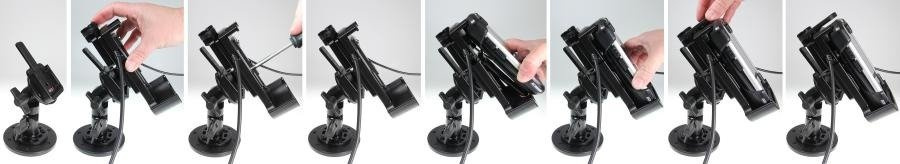 Uchwyt wyposażony jest w głowicę obrotową, która umożliwia jego regulację w różnych kierunkach w celu np. uniknięcia odbicia światła na ekranie. Możesz regulować ustawienie uchwytu o 22° w każdym kierunku. Uchwyt umożliwia jednocześnie ustawienie terminala w pionie lub w poziomie. Zamontuj swój uchwyt do terminala na ProClip’ie samochodowym.