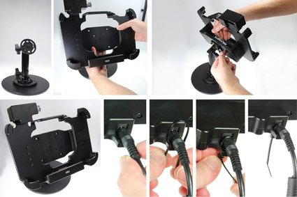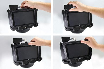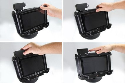 Uchwyt jest również idealnym rozwiązaniem do zastosowania w sklepach, na wystawach lub w każdym innym miejscu, w którym chcesz używać tabletu przy jednoczesnym zabezpieczeniu go przed łatwym wyjęciem z uchwytu. Jest  on wyposażony w blokadę i w celu usunięcia tabletu z uchwytu trzeba użyć klucza (zestaw zawiera dwa klucze).