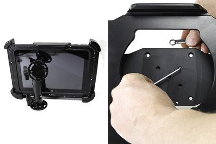 Uchwyt wykonany jest z bardzo mocnego i wytrzymałego tworzywa ABS. Zamontuj go do dowolnej płaskiej powierzchni, w samochodzie ciężarowym, w magazynie, na wózku widłowym itp. Uchwyt posiada w swojej tylnej części standardowe otwory AMPS i VESA. Gdy urządzenie znajduje się w uchwycie, jest pełny dostęp do kamery, wszystkich przycisków funkcyjnych i portów elektronicznych.