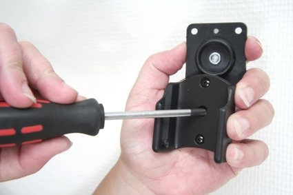 - Umieść uchwyt na płytce montażowej głowicy obrotowej w taki sposób, aby można było dokręcić śrubę znajdującą się w centralnej części uchwytu. Śrubę należy dokręcić dość mocno, a następnie lekko poluzować, aby możliwa była regulacja uchwytu.