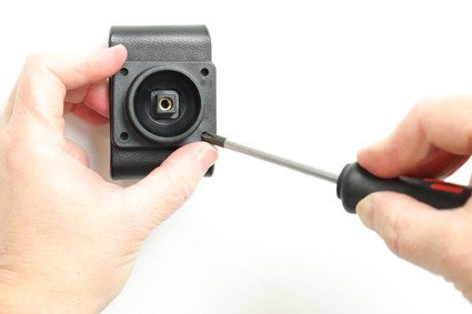 3. Umieść uchwyt na płytce montażowej głowicy obrotowej w taki sposób, aby można było dokręcić śrubę znajdującą się w centralnej części uchwytu. Śrubę należy dokręcić dość mocno, a następnie lekko poluzować, aby możliwa była regulacja uchwytu.