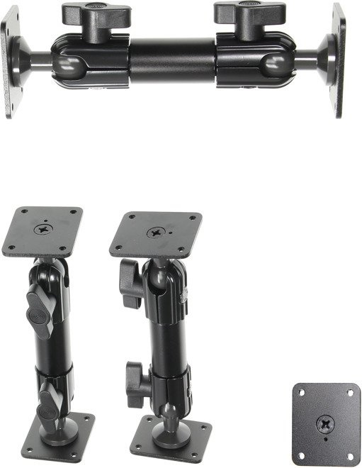 Podwójne ramię o długości 165mm, osadzone na przegubach kulowych z dwiema kwadratowymi podstawami o wymiarach 50x42mm z wstępnie nawierconymi otworami w systemie AMPs. Idealnie nadaje się na wózki widłowe, ale także doskonale sprawdzi się w innych zastosowaniach. Ramię posiada szeroki zakres regulacji, który wynosi 360 stopni w poziomie, a także 210 stopni jeśli chodzi o pozycje wertykalną bądź horyzontalną. Dodatkowo ramię posiada 2 zintegrowane z nim pokrętła motylkowe, dzięki którym można w bardzo prosty i szybki sposób wyregulować mocowanie bez pomocy narzędzi.