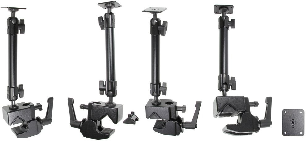 W zestawie znajduje się klamra montażowa na wózek widłowy, ramię na przegubach kulowych oraz kwadratowe podstawy