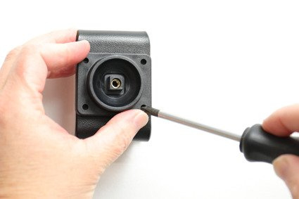 - Umieść uchwyt na płytce montażowej głowicy obrotowej w taki sposób, aby można było dokręcić śrubę znajdującą się w centralnej części uchwytu. Śrubę należy dokręcić dość mocno, a następnie lekko poluzować, aby możliwa była regulacja uchwytu.