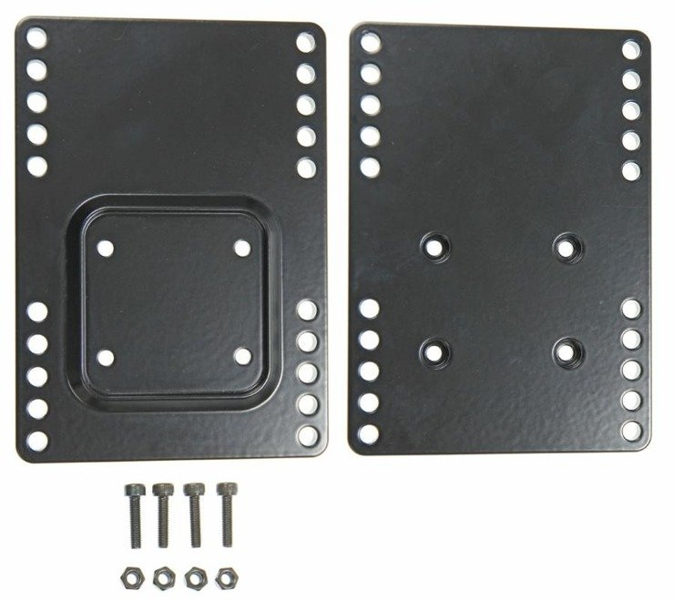 Kwadratowa podstawa z 5 zestawami otworów (4 x 75 mm) VESA, oraz 1 zestawem otworów AMPs. W skład zestawu wchodzi: płytka montażowa, 4 śrubki i 4 nakrętki.