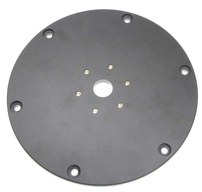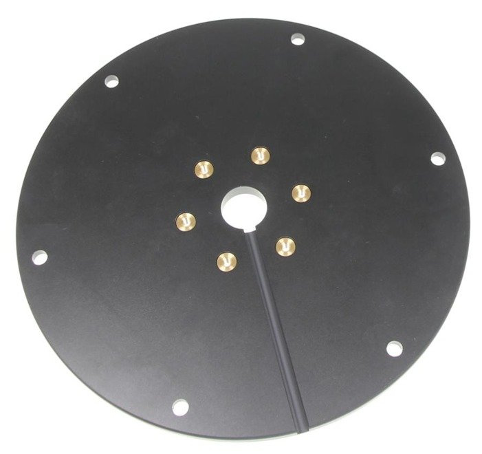 Okrągła podstawa montażowa o średnicy 200 mm oraz grubości 9 mm. Posiada wstępnie nawiercone otwory. W zestawie znajduje się 6 śrub oraz 1 klucz imbusowy.