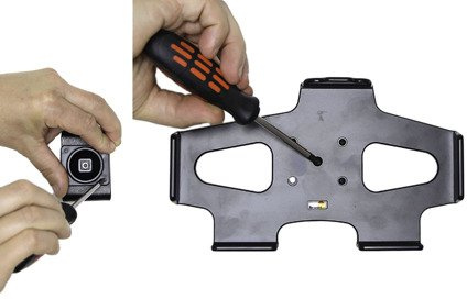 - Umieść uchwyt na płytce montażowej głowicy obrotowej w taki sposób, aby można było dokręcić śrubę znajdującą się w centralnej części uchwytu. Śrubę należy dokręcić dość mocno, a następnie lekko poluzować, aby możliwa była regulacja uchwytu.