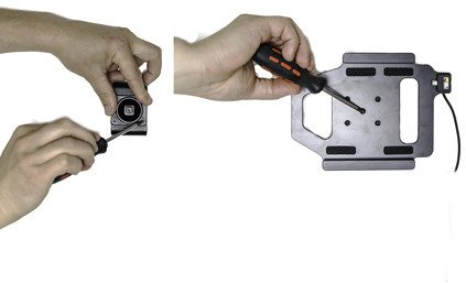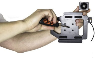 - Umieść uchwyt na płytce montażowej głowicy obrotowej w taki sposób, aby można było dokręcić śrubę znajdującą się w centralnej części uchwytu. Śrubę należy dokręcić dość mocno, a następnie lekko poluzować, aby możliwa była regulacja uchwytu.