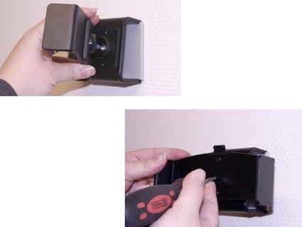 - Umieść uchwyt na płytce montażowej głowicy obrotowej w taki sposób, aby można było dokręcić śrubę znajdującą się w centralnej części uchwytu. Śrubę należy dokręcić dość mocno, a następnie lekko poluzować, aby możliwa była regulacja uchwytu.
