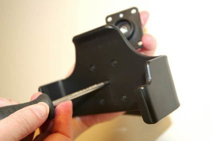- Umieść uchwyt na płytce montażowej głowicy obrotowej w taki sposób, aby można było dokręcić śrubę znajdującą się w centralnej części uchwytu. Śrubę należy dokręcić dość mocno, a następnie lekko poluzować, aby możliwa była regulacja uchwytu.