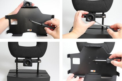 Uchwyt wyposażony jest w głowicę obrotową, która umożliwia jego regulację w różnych kierunkach w celu np. uniknięcia odbicia światła na ekranie. Możesz regulować ustawienie uchwytu o 22° w każdym kierunku. Uchwyt umożliwia jednocześnie ustawienie tabletu w pionie lub w poziomie. Zamontuj swój uchwyt do tabletu na ProClip’ie samochodowym lub na specjalnym uchwycie montażowym do zagłówka.