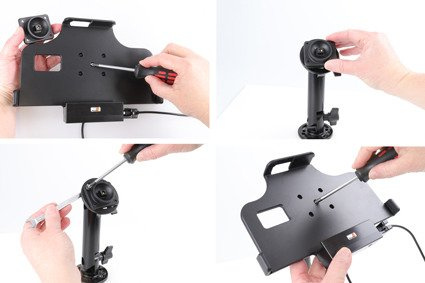 Uchwyt wyposażony jest w głowicę obrotową, która umożliwia jego regulację w różnych kierunkach w celu np. uniknięcia odbicia światła na ekranie. Możesz regulować ustawienie uchwytu o 22° w każdym kierunku. Uchwyt umożliwia jednocześnie ustawienie tabletu w pionie lub w poziomie. Zamontuj swój uchwyt do tabletu na ProClip’ie samochodowym lub na specjalnym uchwycie montażowym do zagłówka.