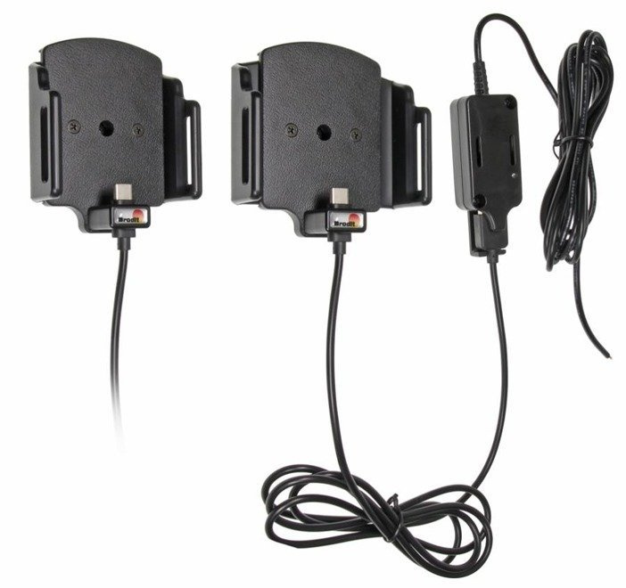 - 527840 - uchwyt uniwersalny aktywny do instalacji na stałe z głowicą obrotową, adapterem Molex oraz 2A ładowarką z wtykiem USB-C do smartfonów bez futerału oraz w futerale lub etui o wymiarach: 62-77 mm (szer.), 6-10 mm (grubość).