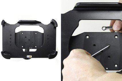 Uchwyt wykonany jest z bardzo mocnego i wytrzymałego tworzywa ABS. Zamontuj go do dowolnej płaskiej powierzchni, w samochodzie ciężarowym, w magazynie, na wózku widłowym itp. Uchwyt posiada w swojej tylnej części standardowe otwory AMPS i VESA. Gdy urządzenie znajduje się w uchwycie, jest pełny dostęp do kamery, wszystkich przycisków funkcyjnych i portów elektronicznych.