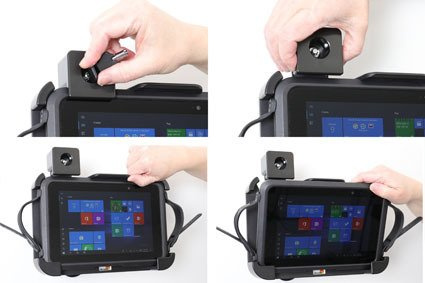 Uchwyt wykonany jest z bardzo mocnego i wytrzymałego tworzywa ABS. Zamontuj go do dowolnej płaskiej powierzchni, w samochodzie ciężarowym, w magazynie, na wózku widłowym itp. Uchwyt posiada w swojej tylnej części standardowe otwory AMPS i VESA. Gdy urządzenie znajduje się w uchwycie, jest pełny dostęp do kamery, wszystkich przycisków funkcyjnych i portów elektronicznych.