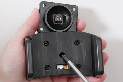 - Umieść uchwyt na płytce montażowej głowicy obrotowej w taki sposób, aby można było dokręcić śrubę znajdującą się w centralnej części uchwytu. Śrubę należy dokręcić dość mocno, a następnie lekko poluzować, aby możliwa była regulacja uchwytu.