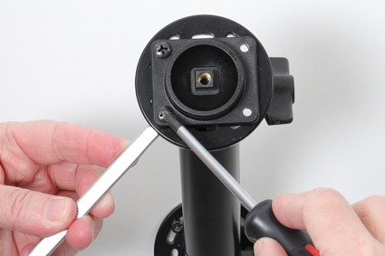 3. Umieść uchwyt na płytce montażowej głowicy obrotowej w taki sposób, aby można było dokręcić śrubę znajdującą się w centralnej części uchwytu. Śrubę należy dokręcić dość mocno, a następnie lekko poluzować, aby możliwa była regulacja uchwytu.