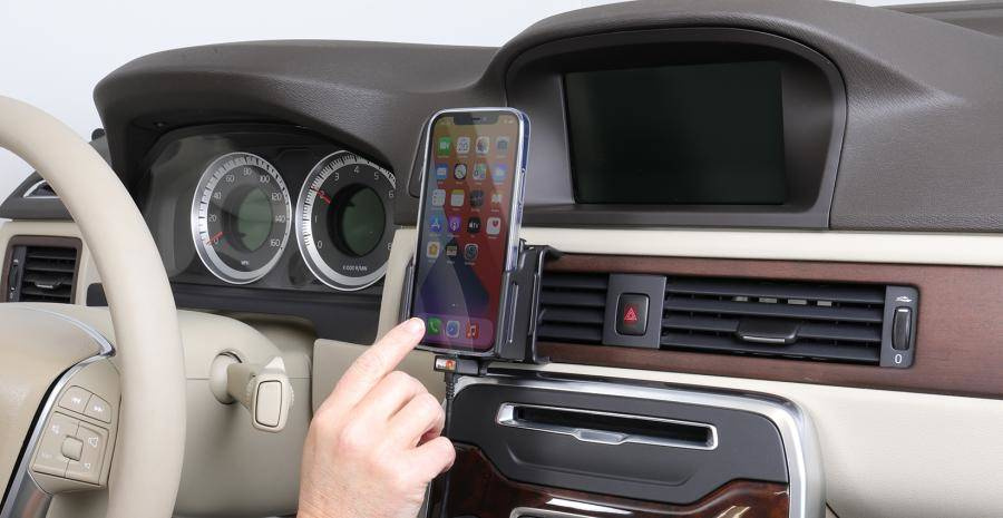 Uchwyt aktywny z kablem USB do Apple iPhone 12 w futerale lub bez o wymiarach: 70-83 mm (szer.), 6-10 mm (grubość).