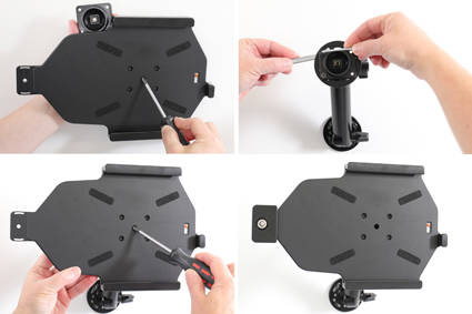 Uchwyt wyposażony jest w głowicę obrotową, która umożliwia jego regulację w różnych kierunkach w celu np. uniknięcia odbicia światła na ekranie. Możesz regulować ustawienie uchwytu o 22° w każdym kierunku. Uchwyt umożliwia jednocześnie ustawienie tabletu w pionie lub w poziomie. Zamontuj swój uchwyt do tabletu na ProClip’ie samochodowym lub na specjalnym uchwycie montażowym do zagłówka.