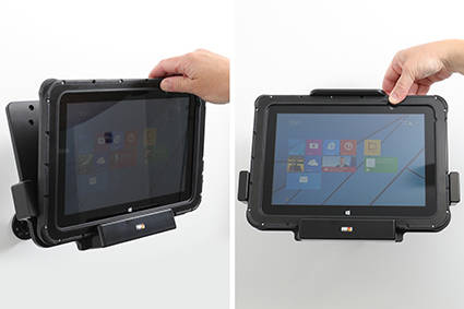 Uchwyt został wykonany z bardzo mocnego i wytrzymałego tworzywa ABS. Zamontuj go do dowolnej płaskiej powierzchni, w samochodzie ciężarowym, w magazynie, na wózku widłowym itp. Uchwyt posiada w swojej tylnej części standardowe otwory AMPS i VESA. Uchwyt nie ogranicza dostępu do kamery, wszystkich przycisków funkcyjnych i portów elektronicznych.