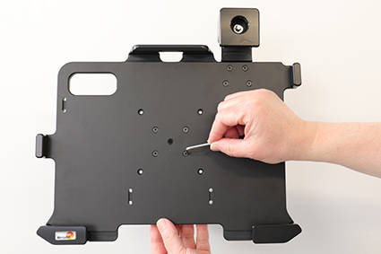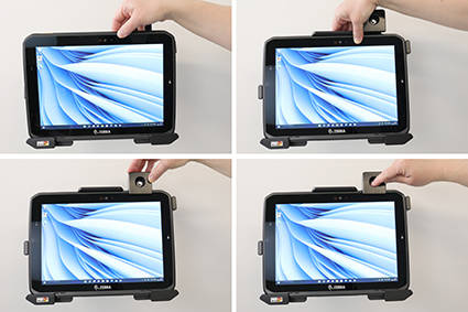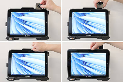 - 739302 - modułowy uchwyt o wzmocnionej konstrukcji do Zebra ET80 z blokadą kluczykową. Jest specjalnie dopasowany do urządzeń, które nie są umieszczone we wzmacnianej obudowie.