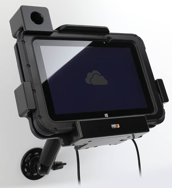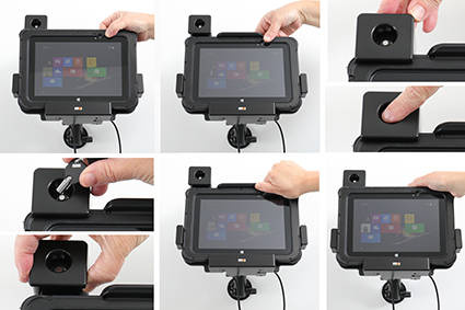 Uchwyt został wykonany z bardzo mocnego i wytrzymałego tworzywa ABS. Zamontuj go do dowolnej płaskiej powierzchni, w samochodzie ciężarowym, w magazynie, na wózku widłowym itp. Uchwyt posiada w swojej tylnej części standardowe otwory AMPS i VESA. Uchwyt nie ogranicza dostępu do kamery, wszystkich przycisków funkcyjnych i portów elektronicznych.