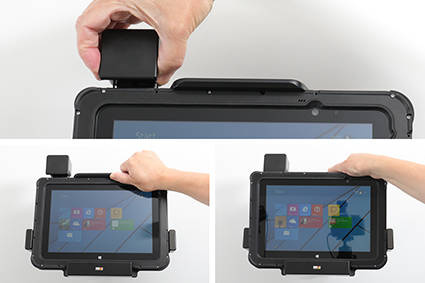 • 741266 - modułowy uchwyt o wzmocnionej konstrukcji do Zebra ET51 10.1 z blokadą sprężynową. Jest specjalnie dopasowany do urządzeń, które są wyposażone w ochronną ramkę oraz dodatkowy pasek na rękę.