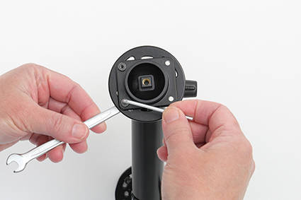 3. Umieść uchwyt na płytce montażowej głowicy obrotowej w taki sposób, aby można było dokręcić śrubę znajdującą się w centralnej części uchwytu. Śrubę należy dokręcić dość mocno, a następnie lekko poluzować, aby możliwa była regulacja uchwytu.