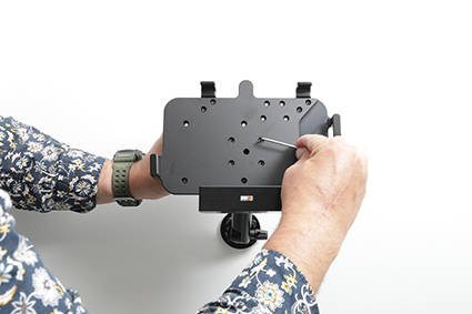 Uchwyt został wykonany z bardzo mocnego i wytrzymałego tworzywa ABS. Zamontuj go do dowolnej płaskiej powierzchni, w samochodzie ciężarowym, w magazynie, na wózku widłowym itp. Uchwyt posiada w swojej tylnej części standardowe otwory AMPS i VESA. Uchwyt nie ogranicza dostępu do kamery, wszystkich przycisków funkcyjnych i portów elektronicznych.